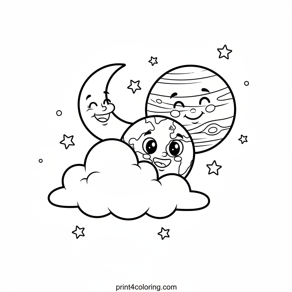 Get ready for a cosmic game! A playful Earth peeks from a fluffy cloud, and a giggling Moon hides behind a friendly cartoon Jupiter. Tiny twinkling stars are scattered around this fun space scene. Grab your crayons and bring this exciting planetary hide-and-seek adventure to life!