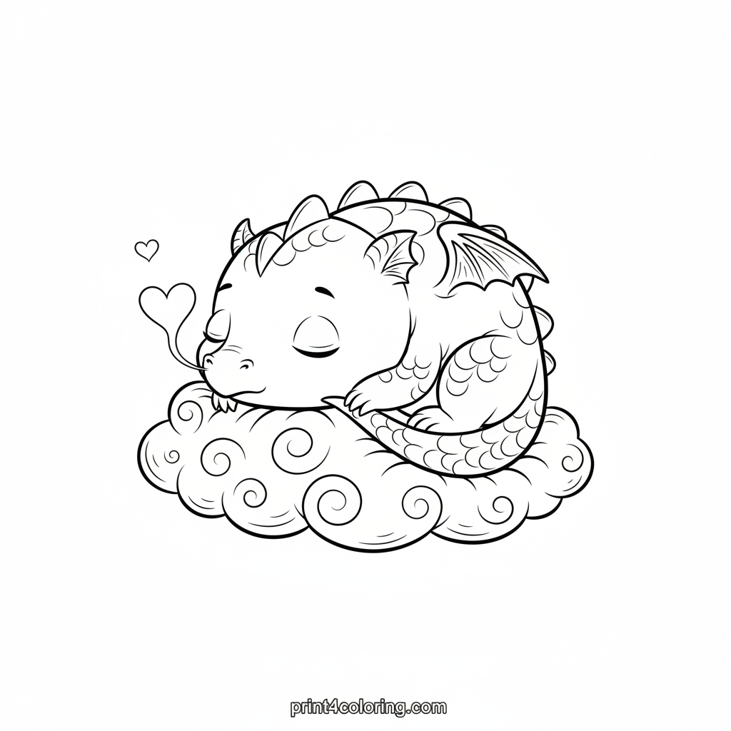 Dive into a world of gentle slumber with this adorable baby dragon. Curled up peacefully on a fluffy cloud, its big, sweet eyes are closed in sleep, while a tiny heart-shaped wisp of smoke drifts from its nose. A truly enchanting scene, perfect for bringing soft colors to life.