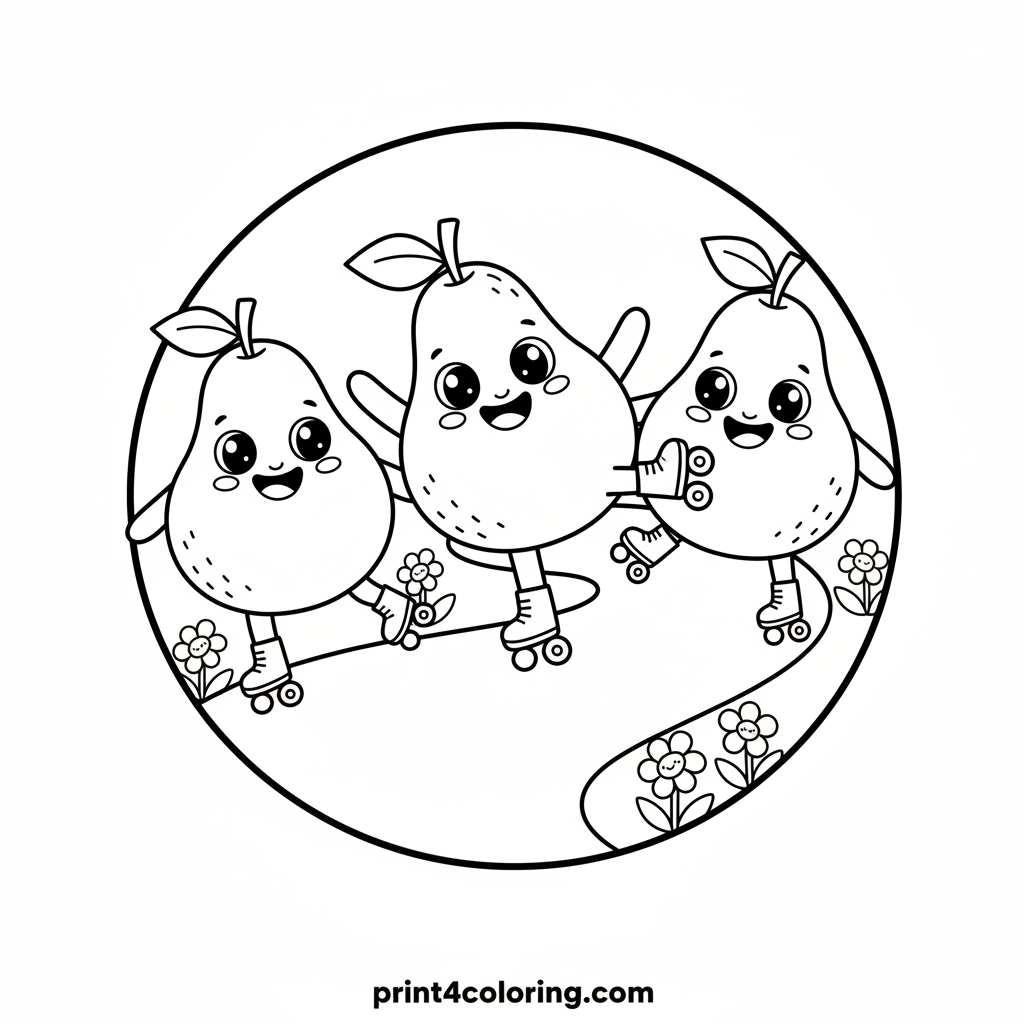 Join three cheerful pears as they zoom down a gentle, wavy path on their roller skates! Each pear wears a big smile, and one is striking a silly pose. Simple, happy flowers line the path, creating a super cute and cozy scene. Get ready for a fun coloring adventure!
