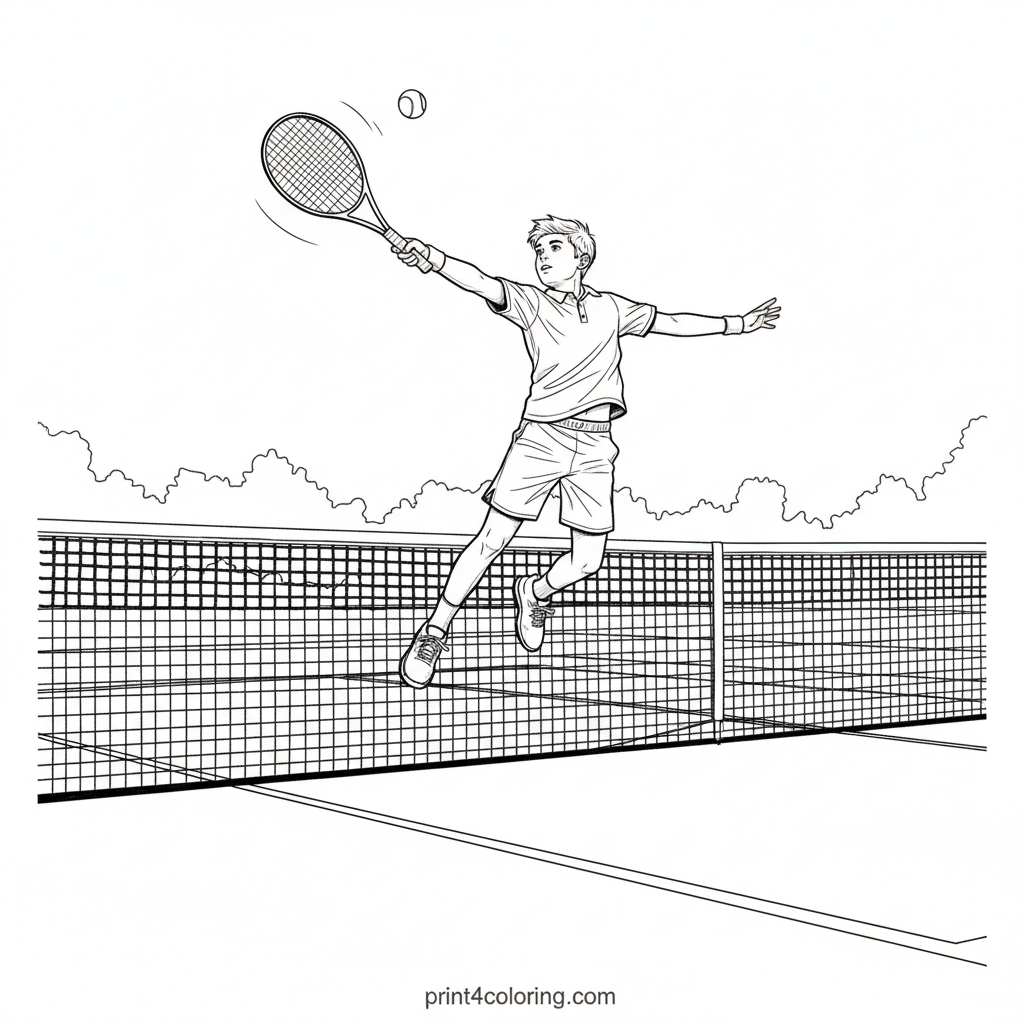 Leap into action with this thrilling coloring page! A determined junior tennis player soars through the air, racket poised to send the ball flying over the net. Capture the excitement of the game, from the intricate net details to the player's dynamic athletic wear. A perfect scene for aspiring athletes to color with vibrant energy!