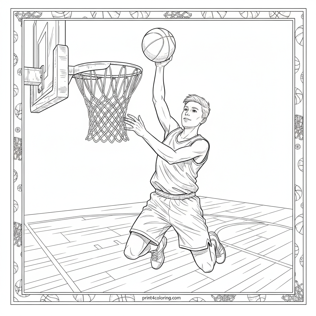 Experience the thrilling moment of a young basketball star soaring through the air for an epic slam dunk! This detailed page captures the player's focus, the intricate net, the court's texture, and dynamic uniform folds, all framed by a cool pattern. Get ready to add vibrant colors to this action-packed scene!