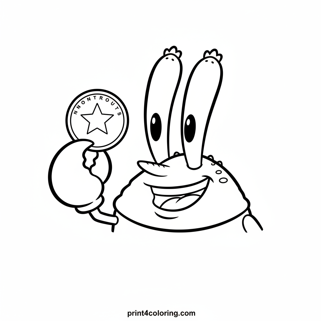 Get ready to smile with Baby Krabs! This adorable close-up portrait shows a very young, super cute Mr. Krabs with big, friendly eyes, beaming with pure delight. He's proudly holding up his very first oversized shiny penny, a true treasure! Perfect for little artists to add bright colors to this happy, memorable moment.