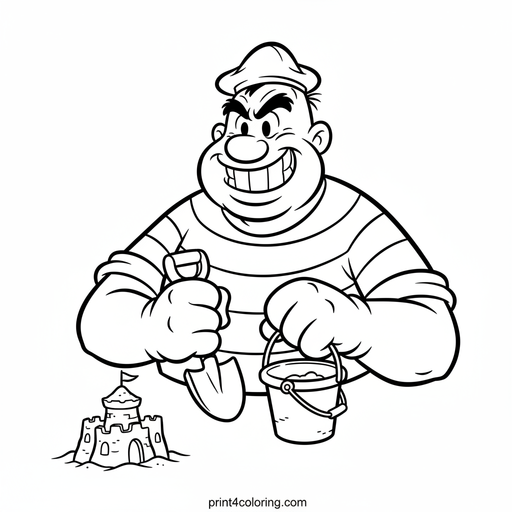 Join Bluto on a sunny beach as he comically attempts to build the most enormous, wobbling sandcastle ever! Watch him focus intently with his tiny shovel and bucket, a little flustered but still beaming. This fun close-up portrait invites you to add vibrant colors to his sandy masterpiece and the lively beach surroundings.