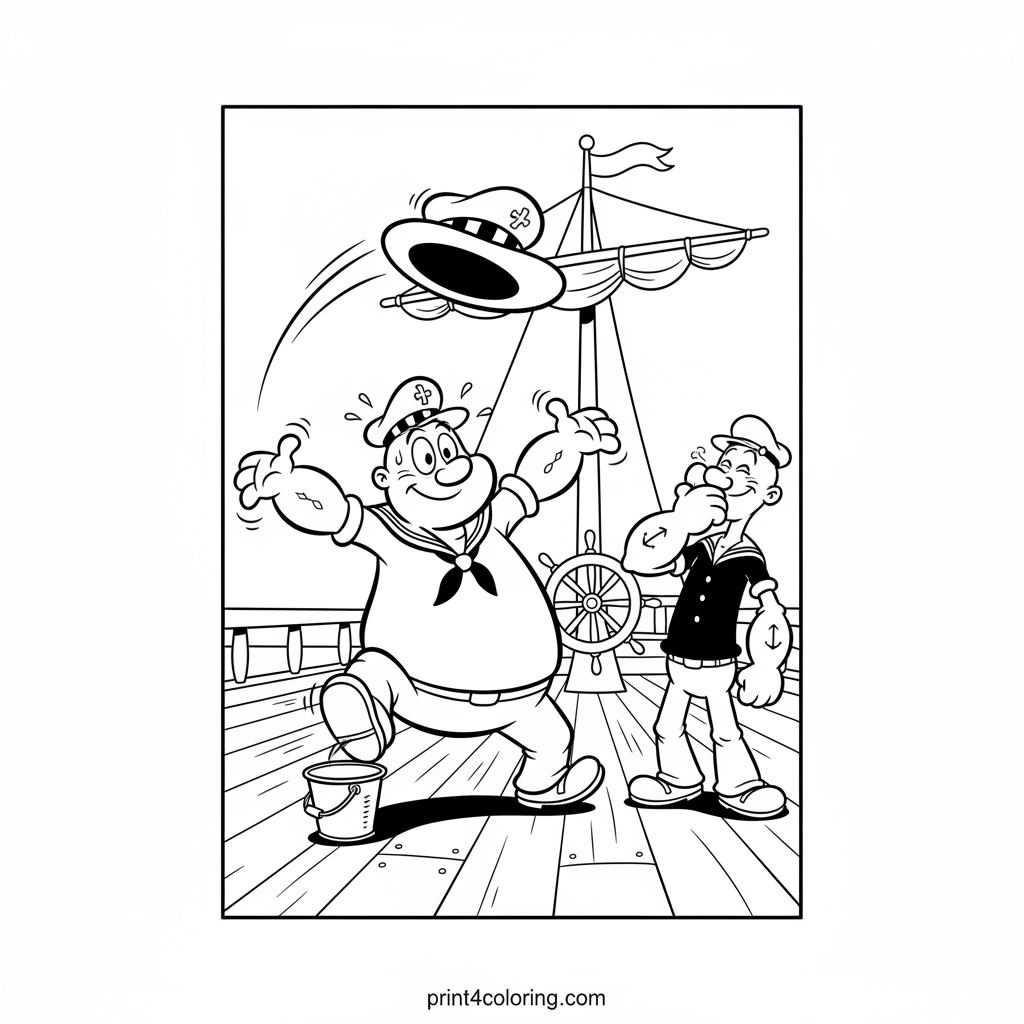 Captain Bluto, wearing an oversized hat, trips comically over a bucket on his ship's deck, sending his hat flying in surprise! Popeye is nearby, trying to stifle a giggle. This hilarious maritime scene is perfect for coloring, capturing the fun of Bluto's silly stumble.