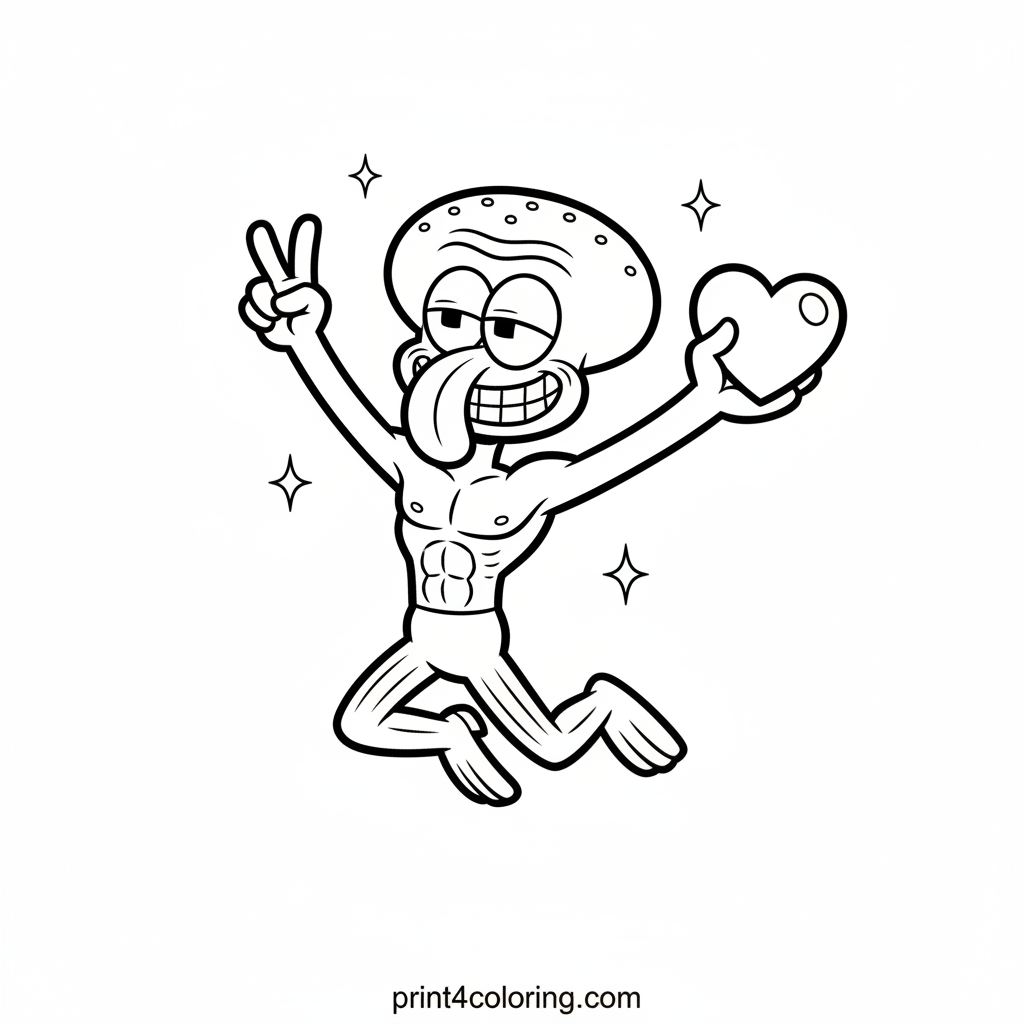 Unleash your creativity with this hilarious coloring page featuring Handsome Squidward! He's striking a dramatic, confident pose with his signature grumpy-but-glamorous expression. A tiny, sparkly glow surrounds him, ready for you to bring out his inner star with vibrant colors. Get ready to make this iconic character shine!