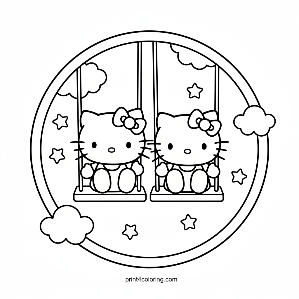 Join Hello Kitty and her twin sister Mimmy for a super fun day at the park! They are giggling and soaring high on their double swing, legs kicked up with big, joyful smiles. This adorable scene is perfect for little artists to bring to life with their favorite colors, capturing their cozy, playful friendship.