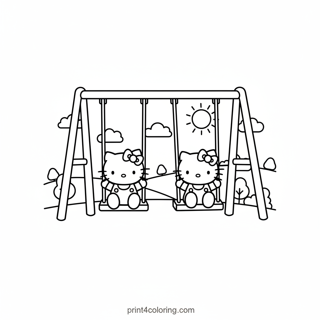 Join Hello Kitty and her twin sister Mimmy as they soar through the air on their favorite double swing! Their legs are kicked high, and their big smiles show how much fun they're having. Imagine the gentle breeze and the happy giggles as they swing back and forth. This delightful scene is perfect for bringing to life with your brightest colors!
