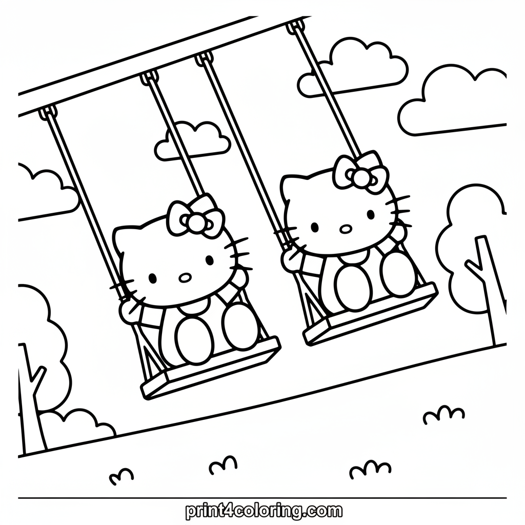 Join Hello Kitty and her twin sister Mimmy as they soar high on a double swing! Their legs are kicked up, smiles are wide, and the joy of playtime fills the air. This delightful scene invites you to add vibrant colors to their playful adventure, making their happy moment even brighter.