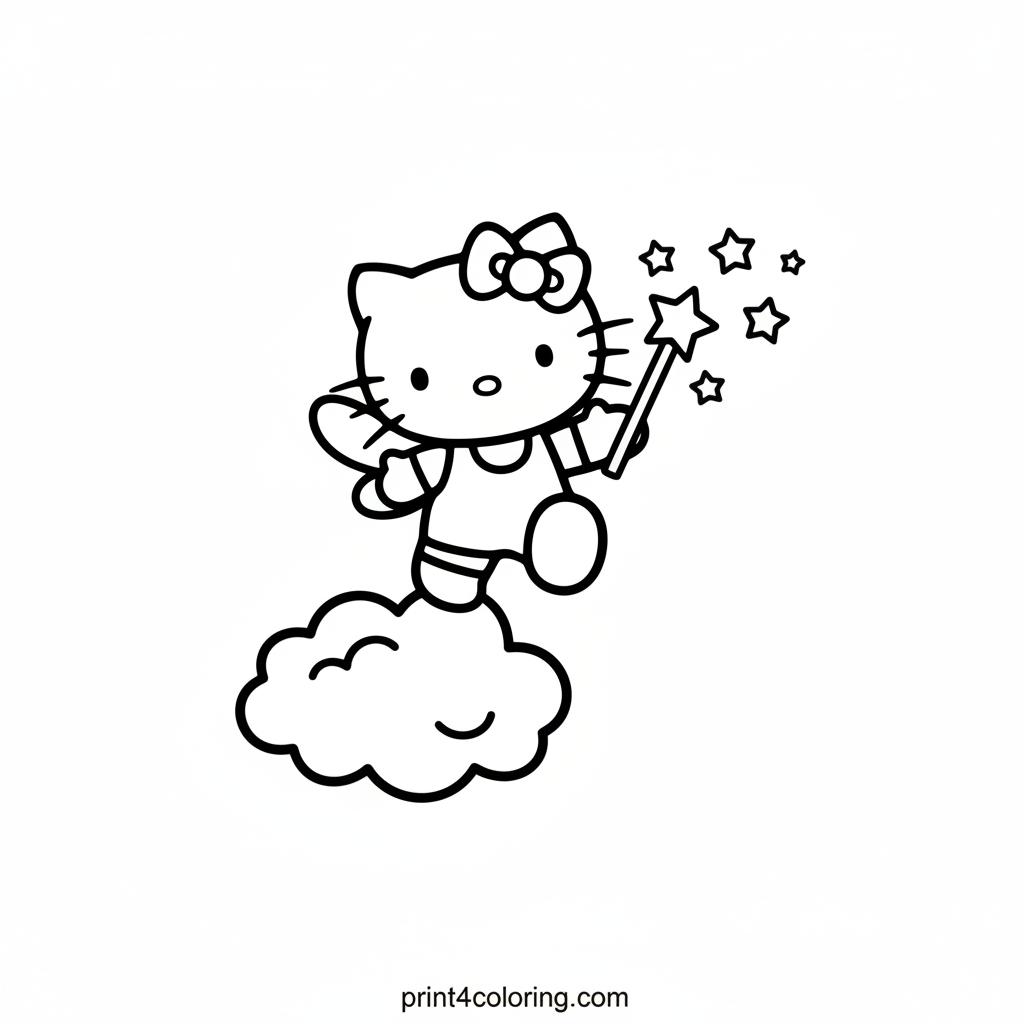 Join Hello Kitty on a magical journey as she becomes a delightful cloud fairy! With her sweet smile, tiny wings, and iconic red bow, she stands gracefully on a fluffy cloud, waving her simple magic wand that sparkles with cheerful stars. Add your favorite colors to this enchanting scene!
