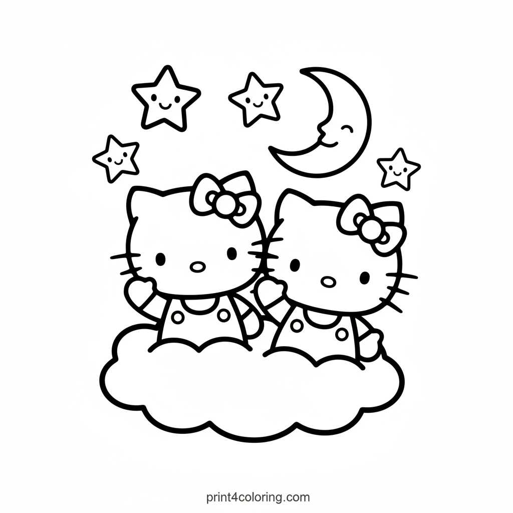 Join Hello Kitty and her twin sister Mimmy on a magical journey! They're gently floating on a super fluffy cloud, high up in a dreamy night sky. Wave hello to the friendly twinkling stars and smiling crescent moons. This adorable scene is perfect for little artists to bring to life with their favorite colors!