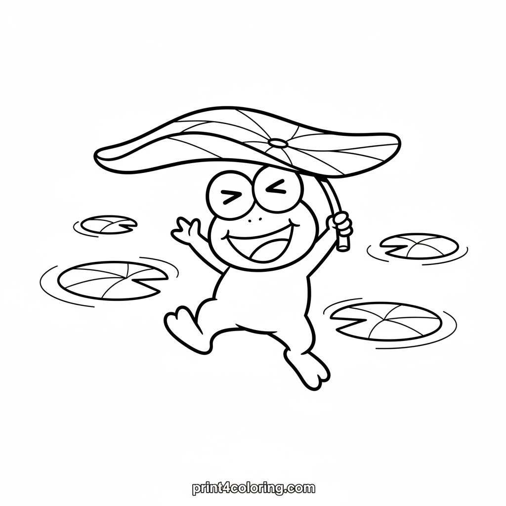 Join Keroppi, the cheerful frog, for a moment of pure fun by the pond! He's trying to balance a giant, silly leaf on his head like a hat, and he can't stop giggling. This adorable scene captures Keroppi's playful spirit as he enjoys a sunny day. Grab your crayons and bring this joyful moment to life!