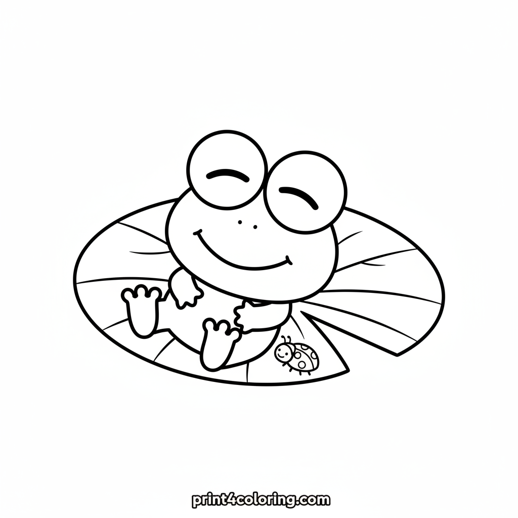 Keroppi, the friendly frog, enjoys a peaceful nap on a big, round lily pad. His kind eyes are closed, dreaming sweet dreams. A tiny, cute ladybug rests gently near his foot, sharing this tranquil moment. Grab your favorite colors and bring Keroppi's adorable nap to life!