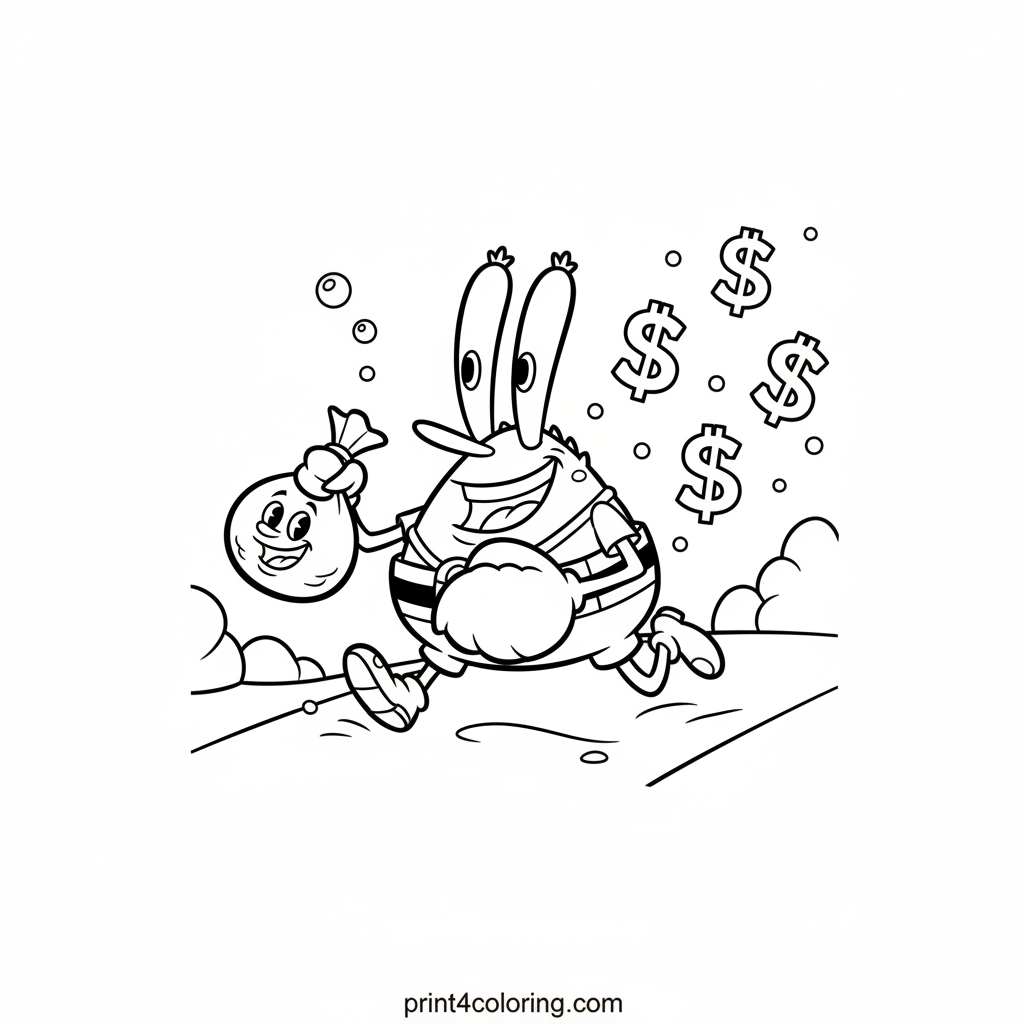 Join Mr. Krabs as he zips along with his favorite treasure โ a cheerful bag of money! See the happy dollar signs trailing behind him as he dashes with glee. This fun scene is perfect for little artists to bring to life with bright colors and imaginative touches, celebrating his joyful sprint.
