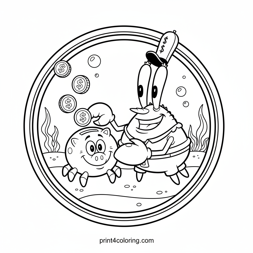 Join Mr. Krabs as he admires his most treasured possession: a whimsical, smiling piggy bank shaped like a friendly crab! With a gentle pat and a happy smile, Mr. Krabs shows off his cozy savings. This delightful scene is perfect for little artists to bring to life with vibrant colors, imagining all the treasures inside!