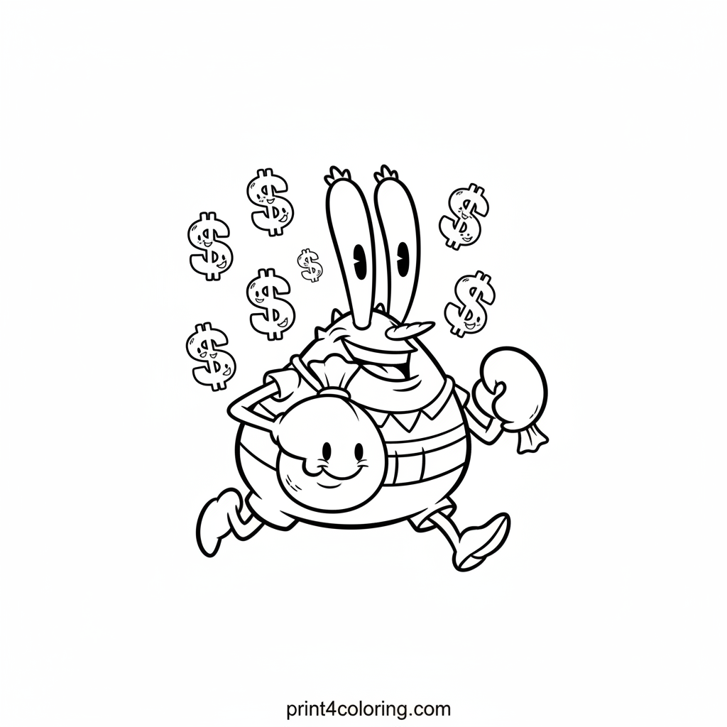 Join Mr. Krabs on his most exciting adventure yet! See him dash with glee, clutching a tiny, smiling bag of money in his claw. A trail of cheerful dollar signs sparkles behind him as he speeds along. It's a joyful scene perfect for little artists to bring to life with their favorite colors!