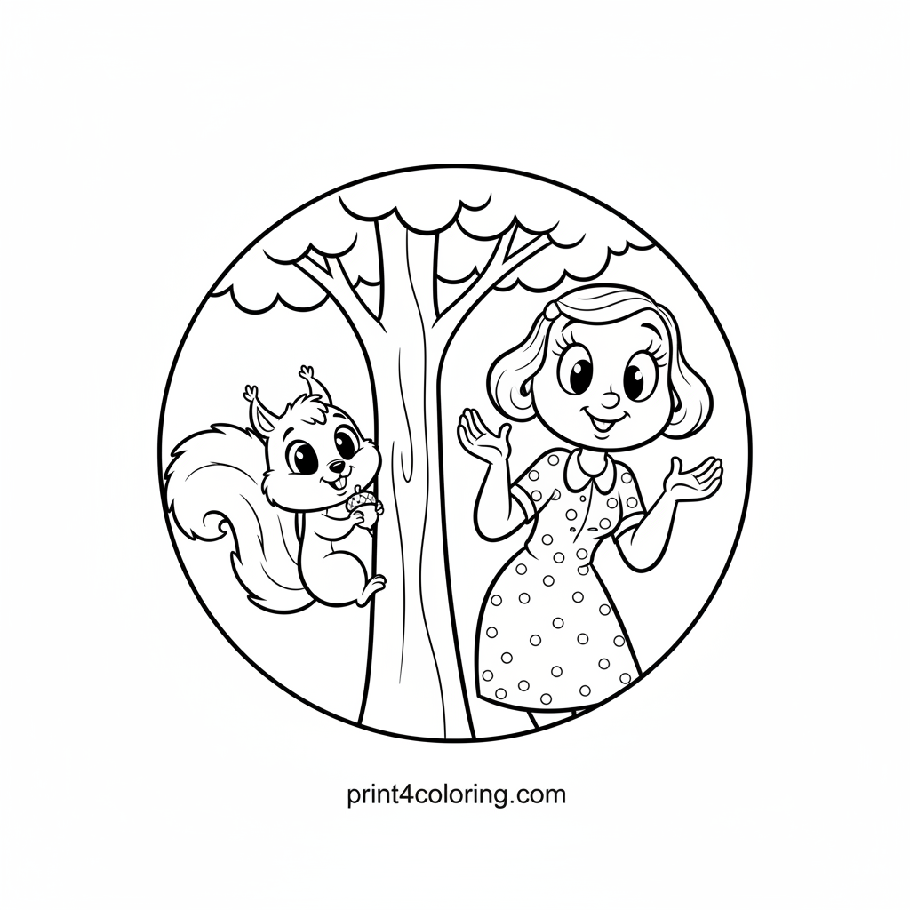 Join Olive Oyl for a charming woodland surprise! She's wide-eyed and delighted as a cute, cartoon squirrel peeks out from behind a tree, offering her a tiny, special acorn. This cozy scene invites you to add vibrant colors to Olive's classic dress, the friendly squirrel, and the rustic tree. Get ready for a delightful coloring journey!