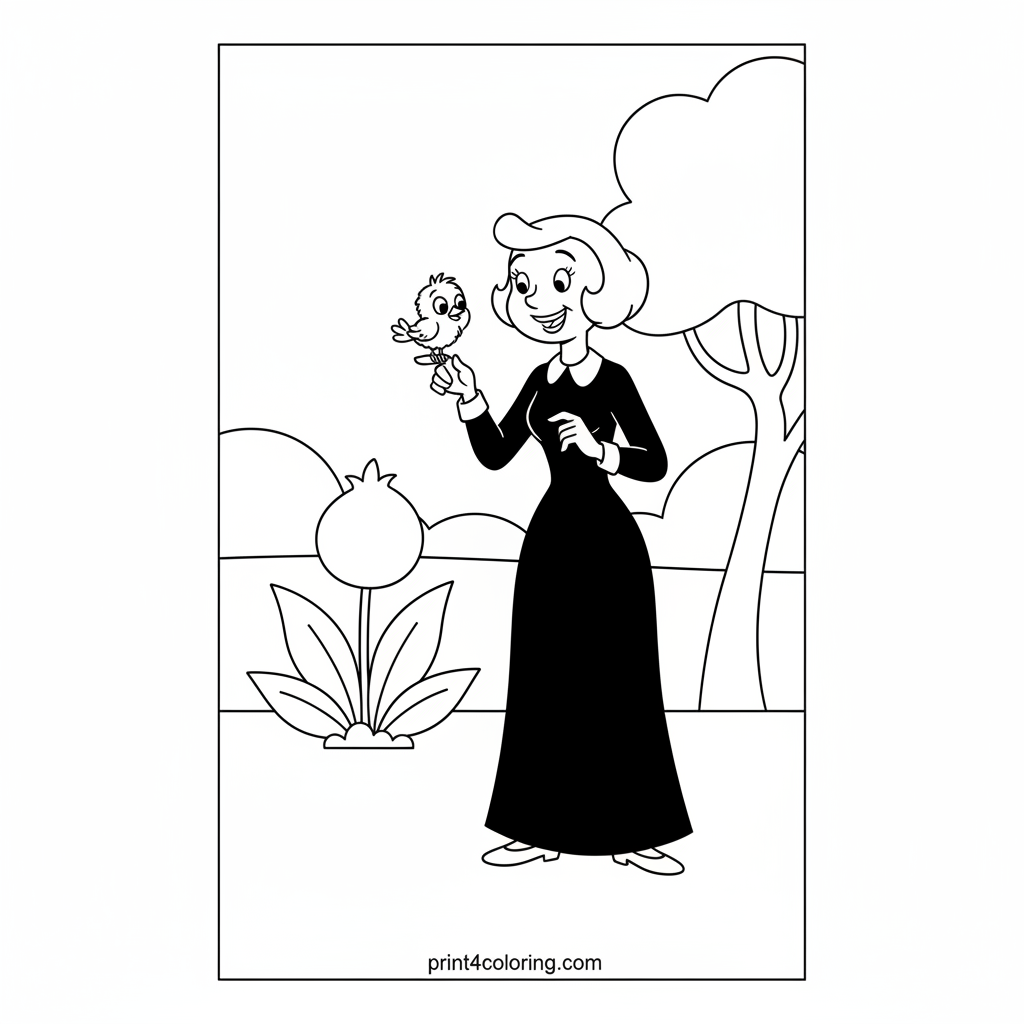 Join Olive Oyl as she shares a heartwarming moment with a tiny, fluffy baby bird! Perched gently on her finger, this little feathered friend looks up with big, curious eyes. Color Olive Oyl's classic dress and bring this sweet scene to life with your favorite colors. A delightful encounter full of gentle surprise and joy!