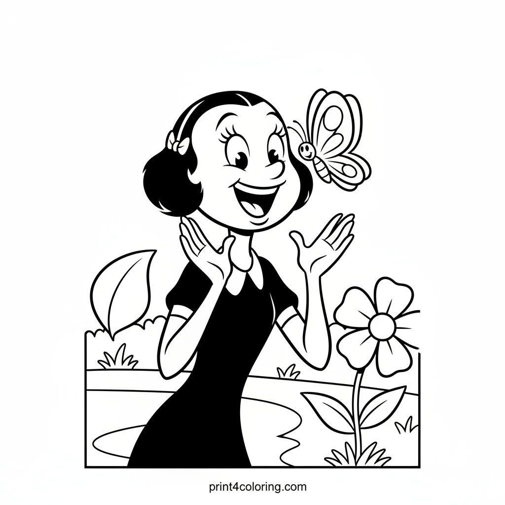 Join Olive Oyl on a sunny garden path as a friendly butterfly flutters right up to her nose! Watch her giggle and playfully bounce back in this delightful scene. Bring her classic dress and the vibrant garden to life with your favorite colors, capturing her joyful surprise.