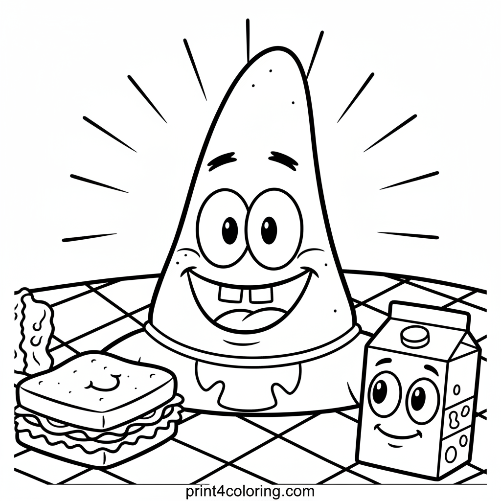 Dive deep into the ocean for a delightful coloring adventure with Patrick Star! He's enjoying a super sunny picnic on a cozy checkered blanket, surrounded by yummy sea snacks and a friendly juice box. Imagine the vibrant colors of the underwater world as you bring this happy scene to life!