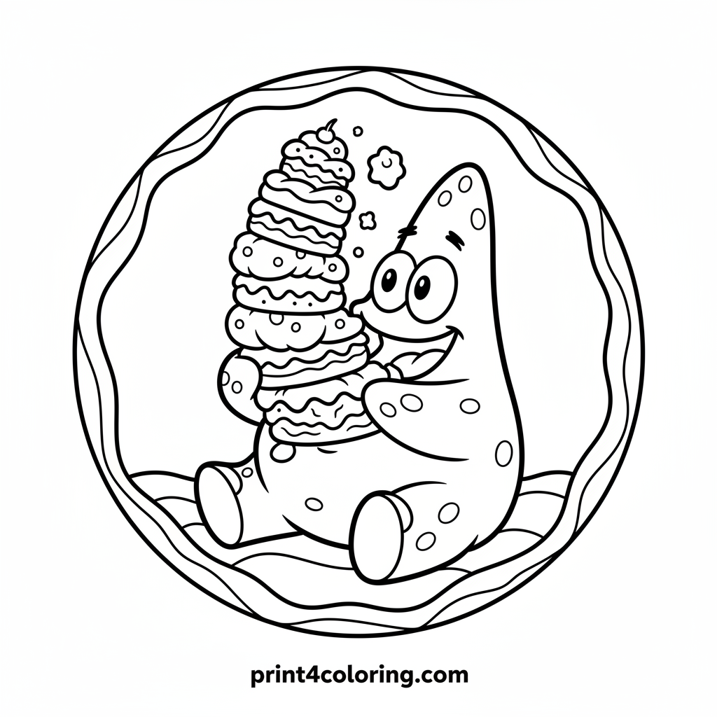 Join Patrick Star as he dives into his dream feast! This super fun coloring page shows Patrick with a huge smile, taking a giant bite out of a towering stack of yummy, imaginary treats. Watch crumbs float playfully around him as you bring this adorable, cozy scene to life with your brightest colors. Get ready for a delicious coloring adventure!