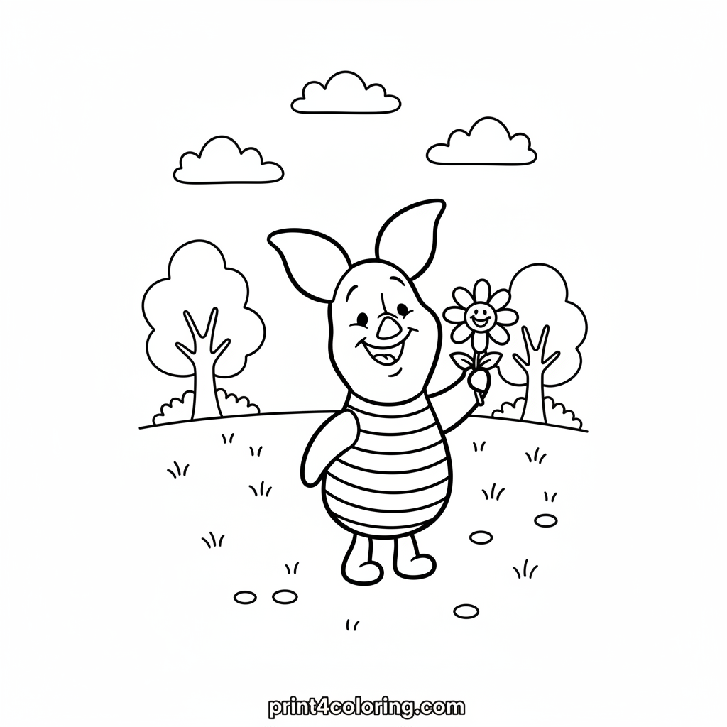 Join Piglet on his favorite shirt day! This sweet little friend is beaming with joy, proudly wearing his iconic pink striped shirt. He's even picked a tiny, cheerful daisy just for you. Get ready to add vibrant colors to Piglet's happy world and make his special day even brighter!