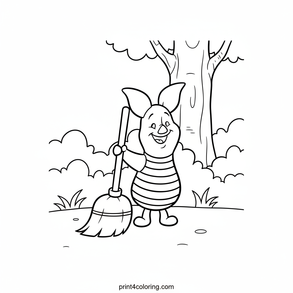 Join Piglet in the Hundred Acre Wood as he proudly shows off his clean corner! Wearing his favorite pink striped shirt, he stands beside his broom, beaming with satisfaction. This heartwarming scene captures Piglet's helpful spirit and the joy of a job well done. Add vibrant colors to his tidy little world!
