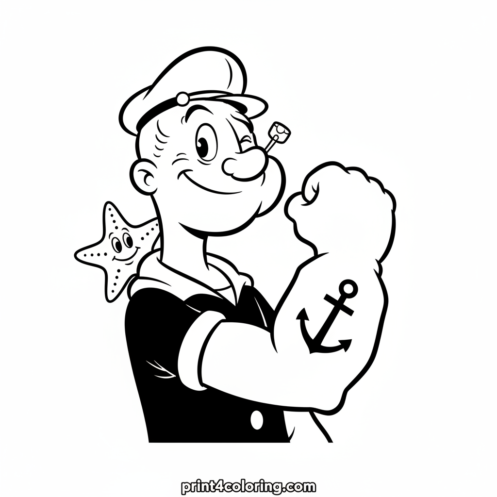 Color Popeye the Sailor Man in this happy portrait! He's winking and gently flexing his arm, proudly showing his anchor tattoo. A cheerful starfish peeks out from behind, smiling too! Bring this friendly nautical scene to life with your favorite colors.