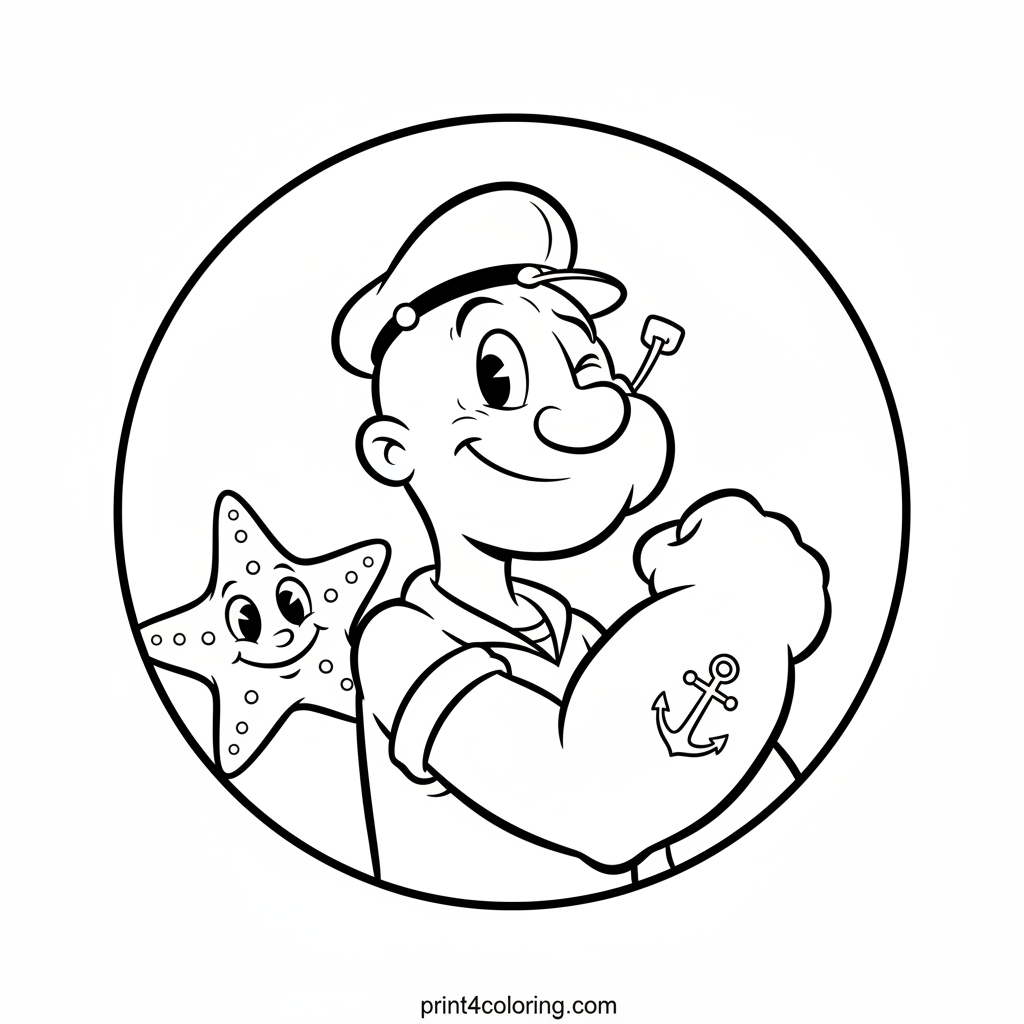 Join Popeye, the famous sailor, as he gives a friendly wink and shows off his gentle muscles! See his tiny anchor tattoo and discover a happy starfish peeking out, sharing a smile. This cozy scene is perfect for bringing to life with your favorite colors, celebrating friendship and strength in a super sweet way!