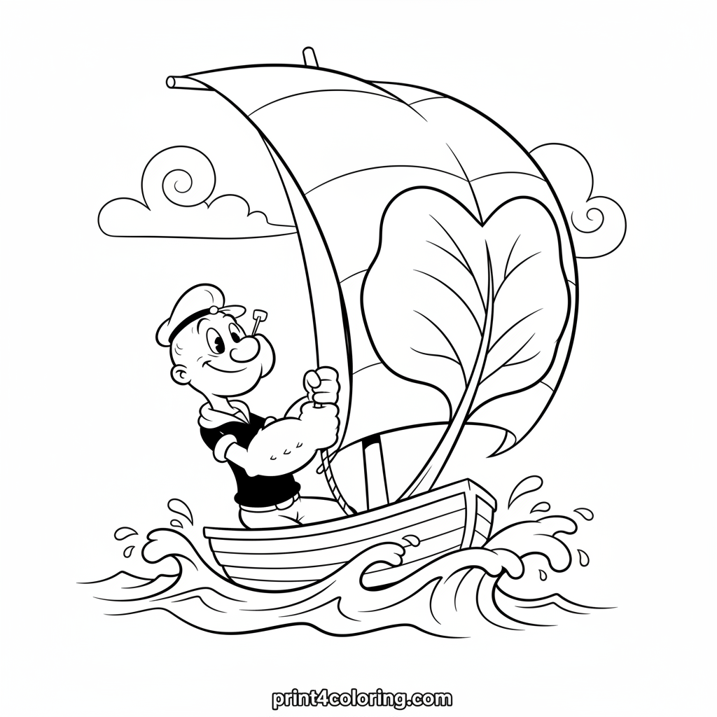 Join Popeye the Sailor Man on a cozy sea adventure! Watch him joyfully hoist a giant, leafy spinach sail on his small sailboat, as playful waves splash around. This fun scene encourages imagination and celebrates the power of healthy greens. Grab your crayons and bring Popeye's strong spirit to life!