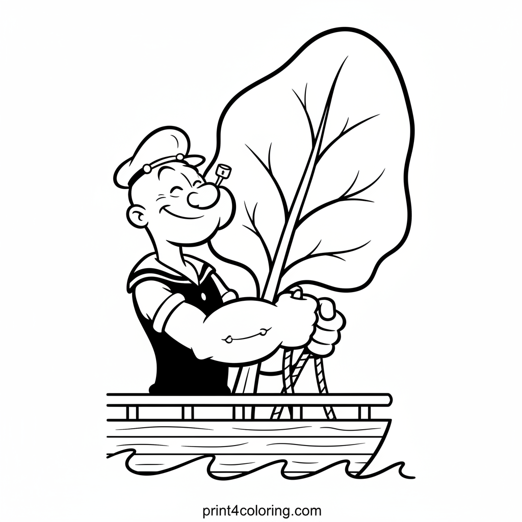 Ahoy there, matey! Join Popeye the Sailor Man on a thrilling spinach sail adventure. See him flexing his muscles, happily pulling up a giant, leafy spinach sail on his simple sailboat. Gentle waves splash around, making this a super fun scene to bring to life with your favorite colors. Get ready for some strong coloring!