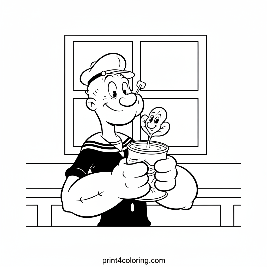Get ready for a leafy adventure with Popeye! This hilarious coloring page shows our favorite sailor looking comically surprised as a tiny, cheerful spinach sprout springs from his can, almost tickling his nose. Bring this super strong moment to life with your brightest colors and make Popeye's day even greener!