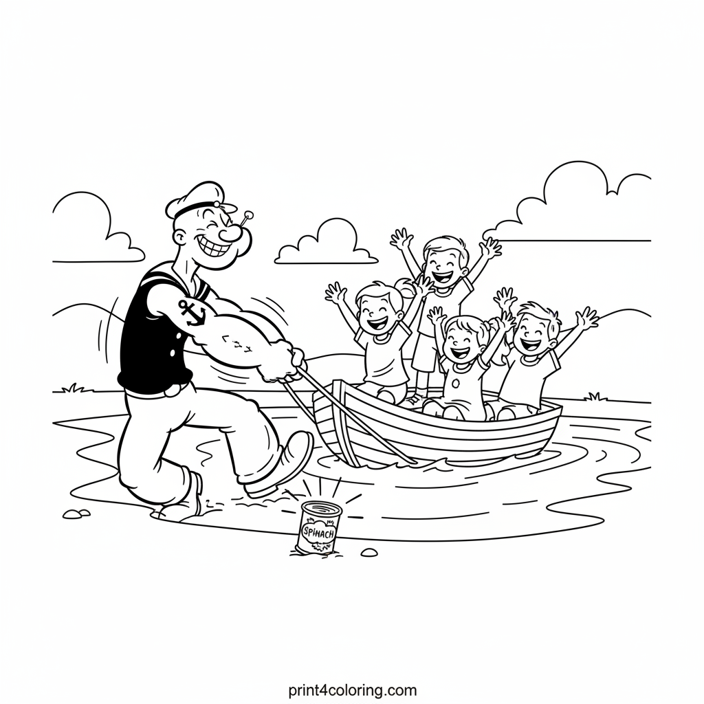 Join Popeye the Sailor Man on a super-strong adventure! After a can of spinach, he's happily pulling a rowboat full of giggling children across a sunny pond. With his anchor tattoo showing and a big smile, it's a day of fun and laughter for everyone. Grab your crayons and add vibrant colors to this cheerful scene!