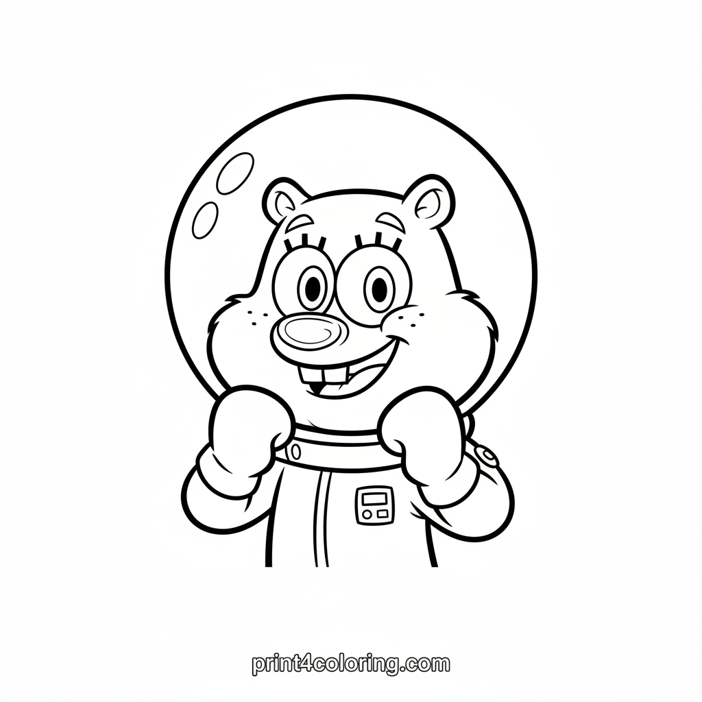 Get ready to color Sandy Cheeks in her iconic spacesuit, striking a powerful yet friendly karate pose! She looks focused and ready for a fun challenge, showing off her amazing martial arts skills. Use your favorite colors to bring this brave squirrel hero to life as she prepares for her next adventure under the sea!