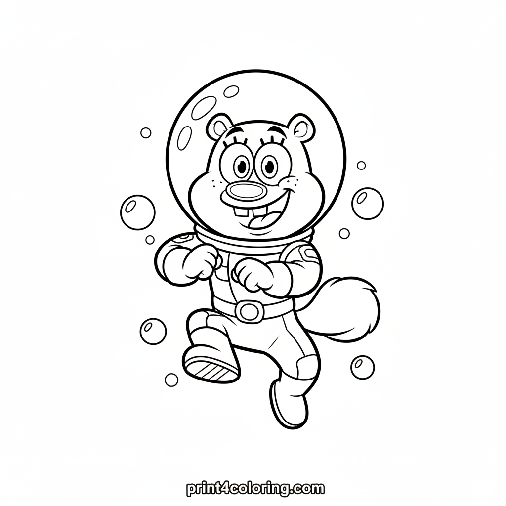 Join Sandy Cheeks as she performs an amazing karate jump high above the ocean floor! Dressed in her special spacesuit, Sandy has a big, happy smile as playful bubbles float all around her. This close-up portrait captures her mid-air action, ready for you to add vibrant colors to her dynamic pose and the bubbly underwater world.