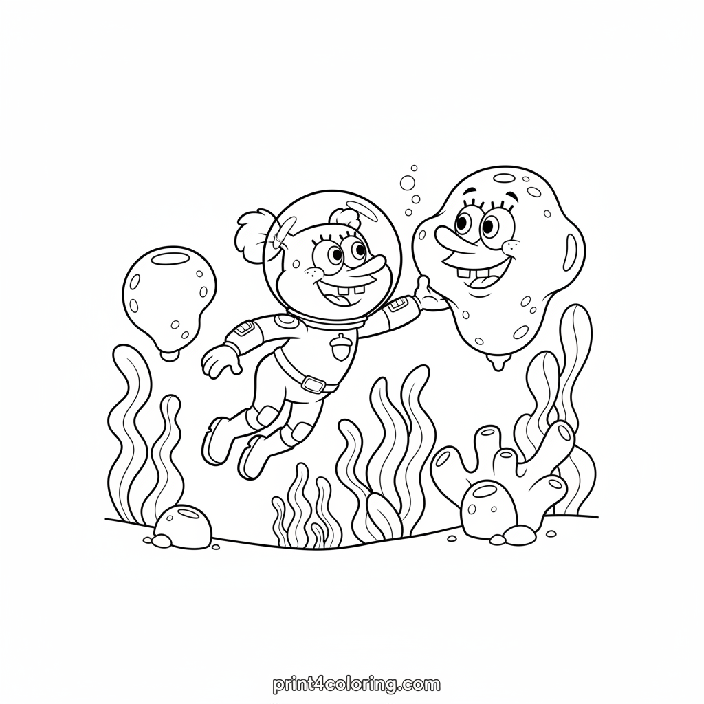 Dive deep with Sandy Cheeks as she joyfully tends her magnificent undersea garden! Explore a vibrant world of friendly coral and swirling seaweed, all growing magically on the ocean floor. Grab your crayons and bring this amazing aquatic scene to life with your favorite colors. What wonders will you discover in Sandy's unique garden?