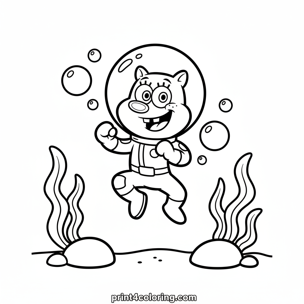Join Sandy Cheeks from Bikini Bottom as she performs an amazing high-flying karate jump! Dressed in her trusty spacesuit, Sandy is mid-air with a big, happy smile, surrounded by playful bubbles. This fun scene captures her adventurous spirit and love for martial arts, ready for you to add vibrant colors.