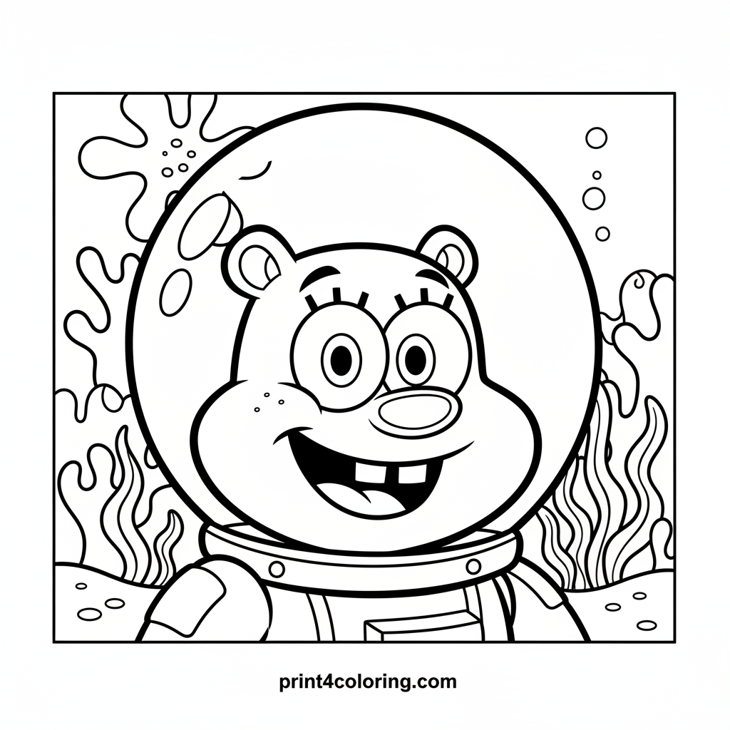Dive deep with Sandy Cheeks as she tends her magnificent undersea garden! This close-up picture shows Sandy, in her trusty spacesuit, surrounded by playful coral and vibrant seaweed. Get ready to add your favorite colors to this whimsical world beneath the waves and bring her happy gardening adventure to life!
