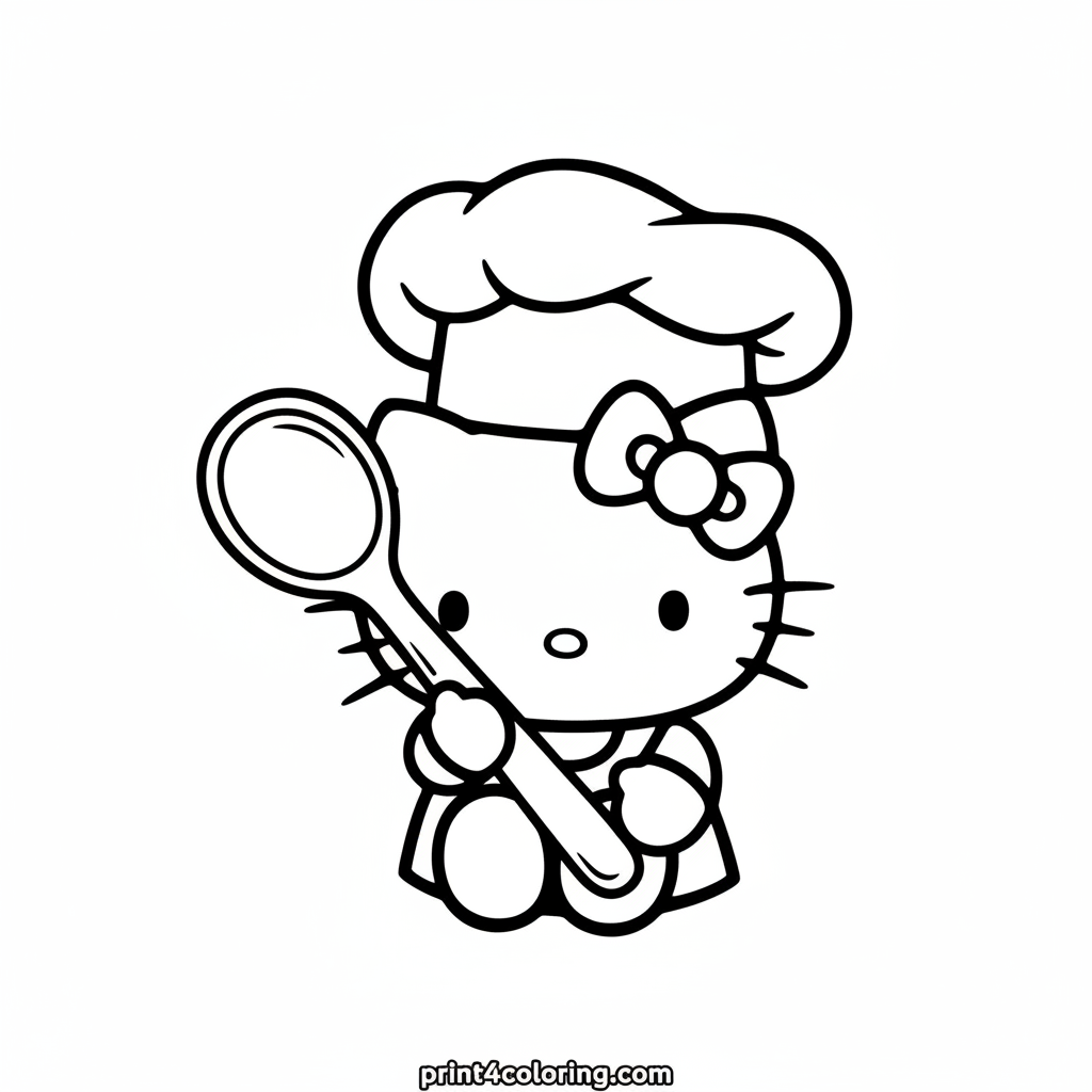 Get ready for some kitchen fun with Hello Kitty! Our favorite feline friend is dressed as a silly chef, complete with a floppy hat that's a bit too big and a giant wooden spoon. She's striking a playfully surprised pose, inviting you to add vibrant colors to her adorable culinary adventure. Imagine the delicious treats she's about to whip up!