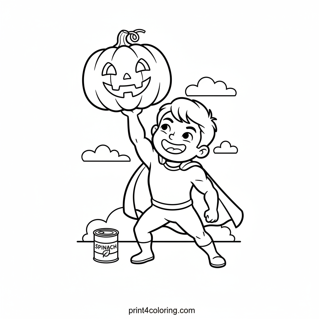 Join a super strong child as they show off their amazing strength, lifting a giant, friendly pumpkin high above their head! A can of spinach nearby hints at their secret. This fun coloring page celebrates healthy eating and the power it gives you. Get ready to add vibrant colors to this inspiring scene!