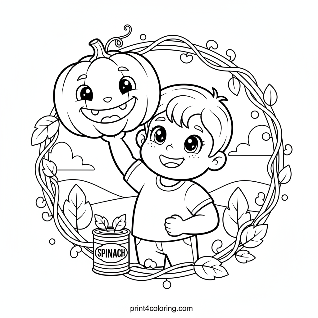 Celebrate amazing strength with a cheerful child who's discovered the power of spinach! See them effortlessly lift a giant, friendly pumpkin high above their head with a beaming smile. This fun scene celebrates healthy eating and the joy of feeling strong and capable. Get ready to add vibrant colors!