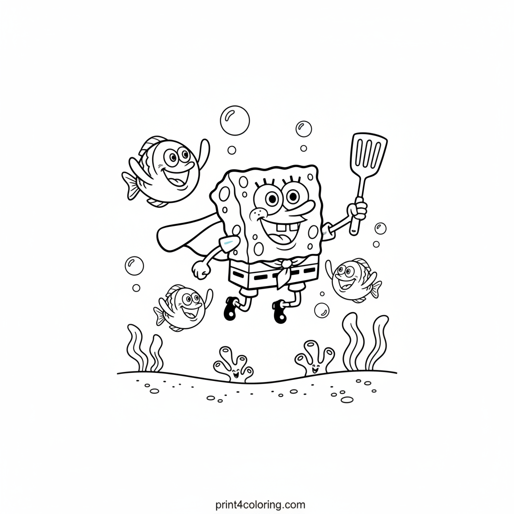 Join SpongeBob SquarePants as he transforms into the amazing Spatula-Man! Watch him 'fly' through the joyful ocean, tiny cape fluttering, spatula held high like a superhero. Friendly fish cheer on our giggling hero, ready for a colorful adventure. Bring this hilarious underwater scene to life with your favorite hues!