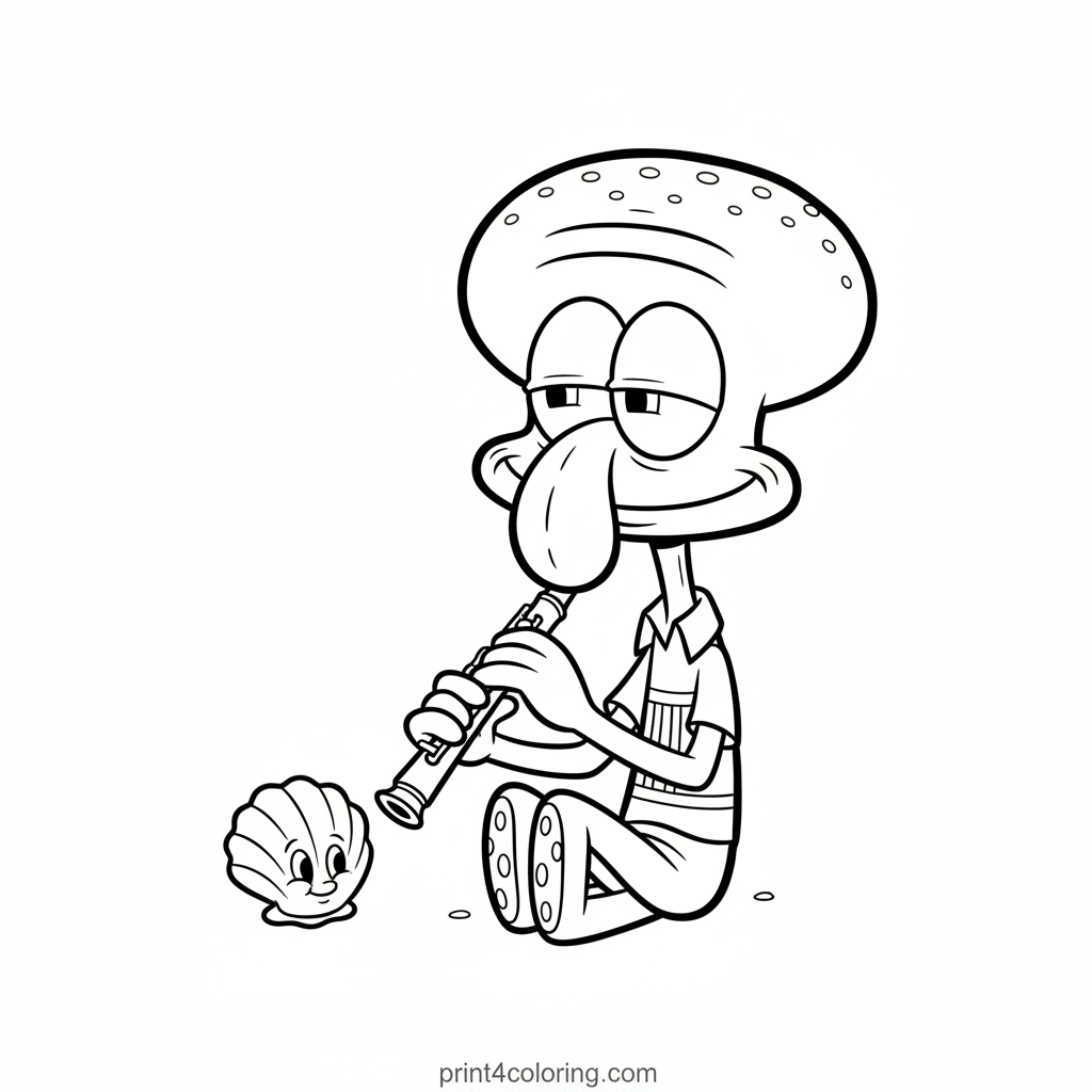 Join Squidward Tentacles in a rare moment of peaceful tranquility! This charming coloring page captures him at home, intently playing a gentle tune on his beloved clarinet. A tiny, friendly seashell sits nearby, captivated by the music. Perfect for young artists to bring this serene scene to life with their favorite colors.