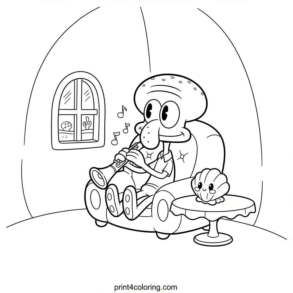 Join Squidward Tentacles in his cozy home as he plays a beautiful, soft tune on his clarinet. A tiny, friendly seashell listens attentively, enjoying the peaceful music. This heartwarming scene captures a moment of calm and musical joy. Grab your crayons and add vibrant colors to Squidward's world and his melodious practice!
