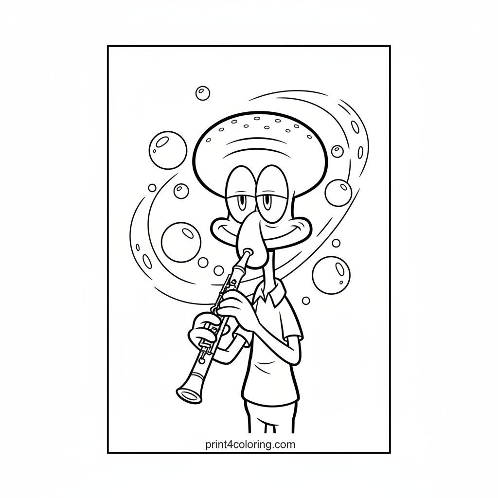 Dive into the ocean with Squidward Tentacles as he plays his beautiful clarinet! His music fills the water with enchanting shimmering bubbles and graceful swirling currents. This close-up portrait lets you bring his underwater masterpiece to life with your favorite colors. Get ready for a musical adventure!