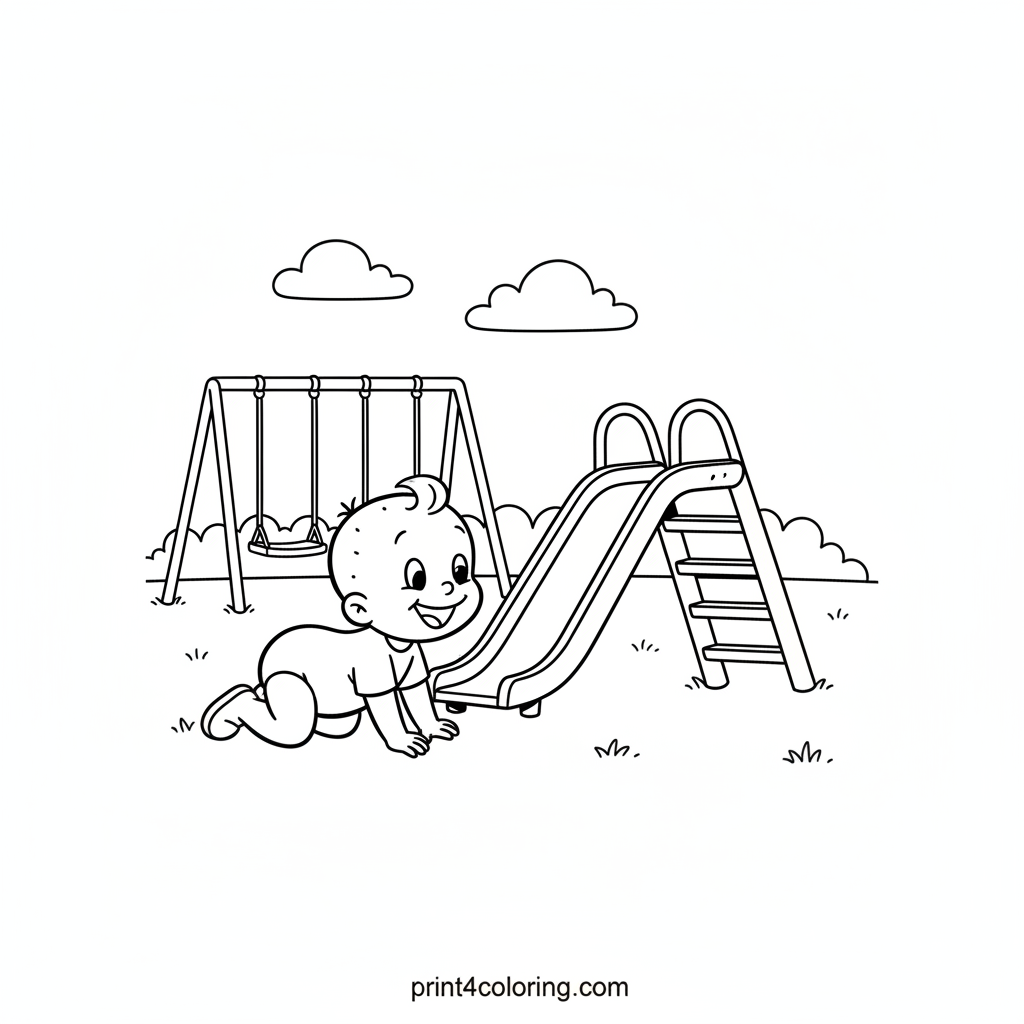 Join Swee'Pea on an exciting playground adventure! This delightful coloring page captures Swee'Pea happily crawling towards a friendly slide under a bright, sunny sky. Imagine the giggles and fun as Swee'Pea gets ready for their very first slide down. A perfect scene for little artists to bring to life with vibrant colors!