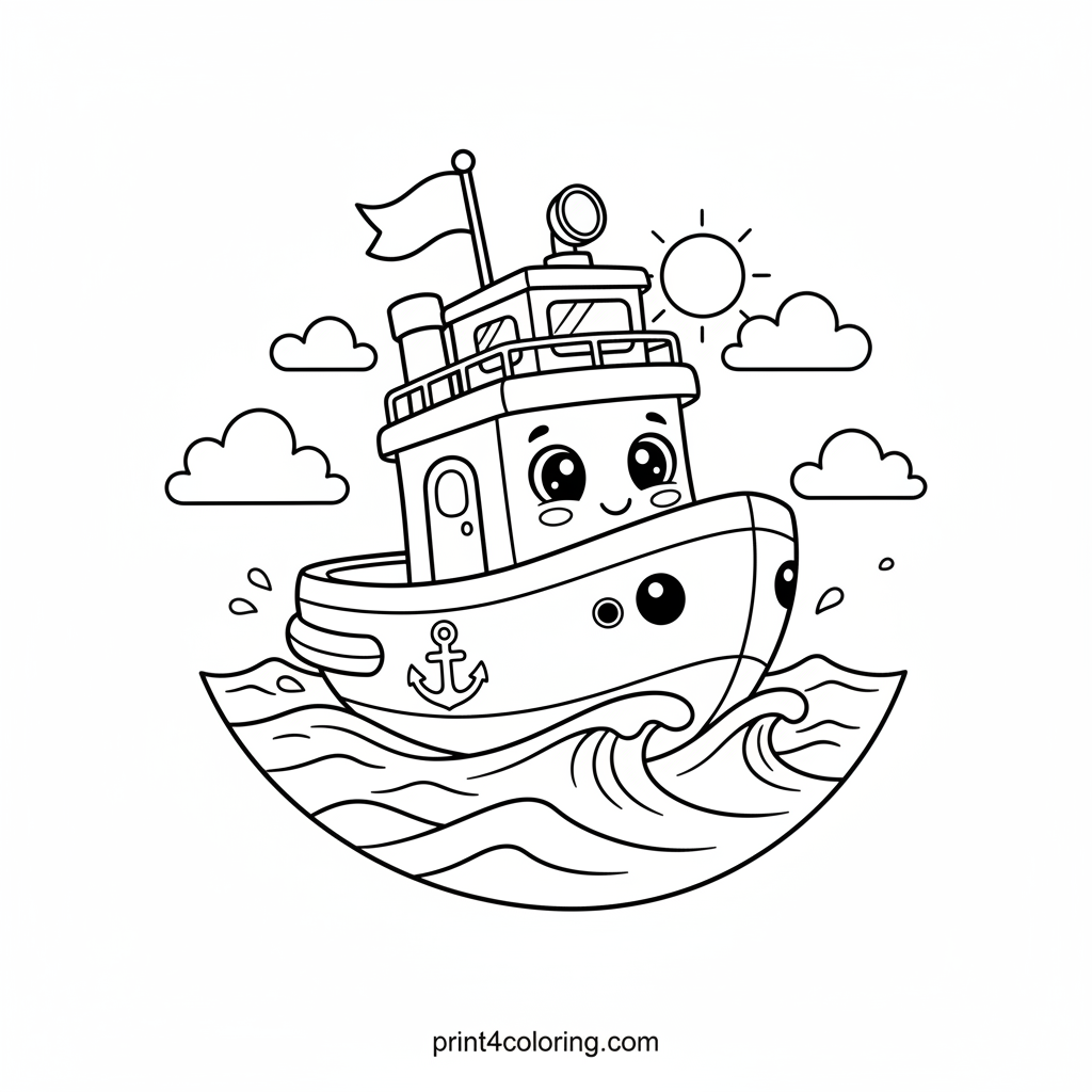 Join our cheerful tugboat as it zips across the gentle ocean waves! With a big smile and a bold anchor symbol painted on its side, this friendly boat is ready for an exciting race. A little flag waves from its mast, making it look extra speedy and cute. Get ready to color a wonderful nautical adventure!