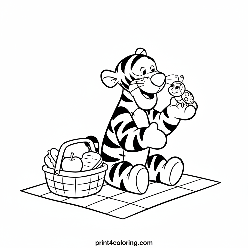 Join Tigger, the bounciest friend from the Hundred Acre Wood, for a super happy picnic! He's sitting on a cozy striped blanket, sharing a giggle with a tiny, friendly ladybug. A basket full of yummy snacks is close by, ready for a delightful treat. Get ready to add vibrant colors to this adorable outdoor scene!