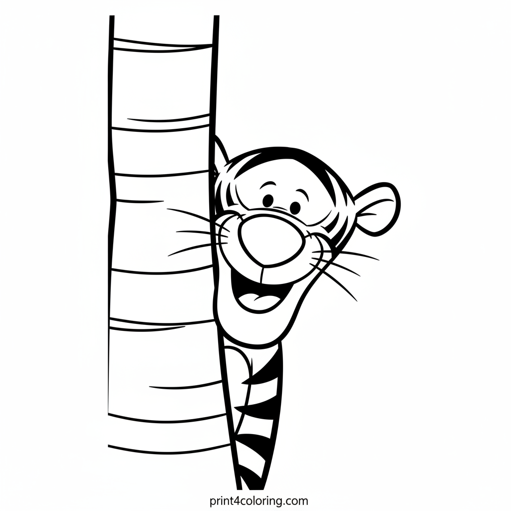 Join Tigger for a fun game of hide-and-seek! Our bouncy friend is peeking playfully from behind a big, striped tree trunk, showing off his famous grin and a bit of his orange and black stripes. Get ready to add vibrant colors to Tigger's cheerful face and his hiding spot. It's time for some bouncy coloring fun!