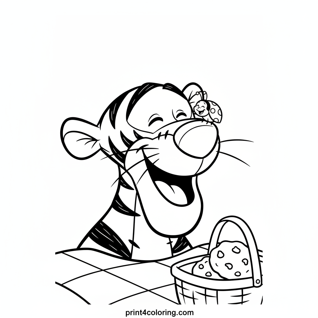 Join Tigger for a super bouncy picnic! He's happily sitting on a striped blanket, sharing a giggle with a tiny ladybug friend. A yummy snack basket is nearby. Use your brightest colors to bring Tigger's famous stripes, the cozy blanket, and his little bug pal to life in this delightful scene!