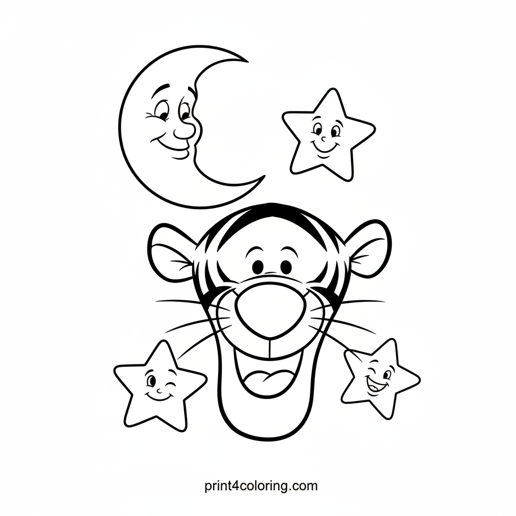 Join Tigger as he bounces with boundless joy, soaring among friendly, winking stars! This close-up portrait captures his pure delight as he reaches playfully for a smiling crescent moon. Get ready to add vibrant colors to Tigger's stripes and the sparkling night sky in this whimsical adventure.